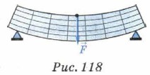 Наблюдать деформацию кручения можно, если взять резиновую трубку и вращать её концы в противоположных направлениях. Предварительно начерченная вдоль трубки прямая примет форму винтовой линии. Деформация кручения возникает при завинчивании гаек, ей подвергаются детали машин, передающие вращательное движение: валы, на которые насажены зубчатые колёса, карданный вал автомобиля и др. Деформация изгиба наблюдается в случае, показанном на рисунке 118. Изгибу подвержены рельсы железнодорожного пути, балки перекрытий в зданиях, коромысло весов и т. п. Как видно из рисунка 118, при изгибе выпуклая сторона тела растягивается, а вогнутая — сжимается. Таким образом, изгиб сводится к растяжению и сжатию различных частей тела.
