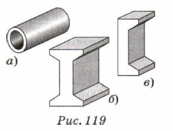 Внутри изгибаемого тела находится слой, который меняет свою форму, но не меняет длину, т. е. не испытывает ни растяжения, ни сжатия. Этот слой называют нейтральным. Вблизи нейтрального слоя тело почти не испытывает деформации, и возникающая здесь сила упругости мала. Поэтому в деталях, подверженных изгибу, можно уменьшить площадь сечения около нейтрального слоя. В строительных конструкциях сплошные стержни заменяют трубами (рис. 119, а), брусья — тавровыми или двутавровыми балками (рис. 119, б), а также швеллерами (рис. 119, в). Это позволяет сэкономить металл и облегчить конструкции, не уменьшая их прочности.