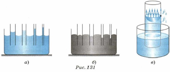 Глава 7. Свойства твёрдых тел и жидкостей § 45. Смачивание. КапиллярностьВогнутую или выпуклую поверхность жидкости в трубке называют мениском. На явлении смачивания основан способ обогащения руды, называемый флотацией. Руду размельчают, взбалтывают в воде и добавляют в эту взвесь масло. В результате перемешивания крупинки ценной руды обволакиваются маслом, которое их смачивает. Крупинки пустой породы не смачиваются маслом, но смачиваются водой. Затем в эту смесь вдувают воздух. Пузырьки воздуха «прилипают» к крупинкам ценной породы, покрытым маслом и потому не смачивающимся водой. Под действием выталкивающей силы они поднимаются вверх. Крупинки пустой породы, смоченные водой и не поддерживаемые воздухом, остаются при этом на дне. Капиллярные явления3. Если в сосуд с водой опустить тонкие трубки, называемые капиллярами, то можно заметить, что вода поднимется по ним и уровень её в трубках будет выше, чем в сосуде (рис. 131, а). Если опустить эти трубки в сосуд со ртутью, то уровень ртути в них будет ниже, чем в сосуде (рис. 131,6). Причём и в том и в другом случае поверхность жидкости в трубках будет изогнутой: поверхность воды вогнутой, а поверхность ртути выпуклой. Причина капиллярных явлений — смачивание или несмачива- ние жидкостью твёрдого тела. Поскольку вода смачивает стекло, то она образует в трубке вогнутый мениск. В этом случае на стенки трубки действует сила поверхностного натяжения