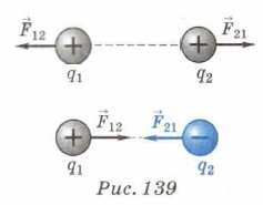 Шарль Огюстен Кулон (1736—1806) — французский учёный, член Парижской академии наук. Известен своими работами по электричеству и магнетизму и исследованием сил трения. Сконструировал чувствительный прибор — крутильные весы, — при помощи которого можно было измерять очень малые силы; установил основной закон электростатики и распространил его на взаимодействие точечных магнитных полюсов. Экспериментальные исследования Кулона имели важное значение для создания теории электромагнитных явлений. Силы взаимодействия двух неподвижных точечных зарядов направлены вдоль прямой, соединяющей их (рис. 139). Поскольку расстояние между зарядами много больше размеров заряженных тел, то их можно считать точечными. В соответствии с третьим законом Ньютона