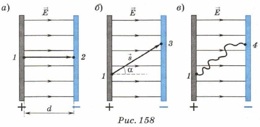 Пусть в однородном электростатическом поле напряжённостью заряд q перемещается из точки 1 в точку 2 (рис. 158, а) вдоль линий напряжённости поля. Работав, совершаемая электростатическим полем по перемещению заряда в этом случае, равна: