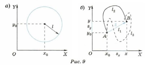 Путь и перемещение2. Как вы уже знаете, путь — это расстояние, пройденное телом вдоль траектории. Если известны начальные координаты тела (х0; у0) и пройденный им путь l, но неизвестна траектория движения, то определить положение этого тела в любой момент времени невозможно. Траектории тела могут быть самыми разнообразными, и, пройдя один и тот же путь, тело может оказаться в любой точке, удалённой от начальной не далее чем на расстояние I (рис. 9, а). С другой стороны, перемещаясь из точки А (х0; у0) в точку В (x; у), тело может пройти совершенно разные пути l1, l2, l3 и т. д. (рис. 9, б), но его конечное положение при этом будет одним и тем же. Поэтому движение характеризуют с помощью физической величины, называемой перемещением.