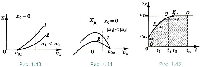 В случае x0 = 0, ах > 0 и υx > υ0x график зависимости координаты от скорости представляет собой параболу (рис. 1.43). При этом, чем больше ускорение, тем ветвь параболы будет менее крутой. Это легко объяснить, так как, чем больше ускорение, тем меньше расстояние, которое должна пройти точка, чтобы скорость увеличилась на то же значение, что и при движении с меньшим ускорением.