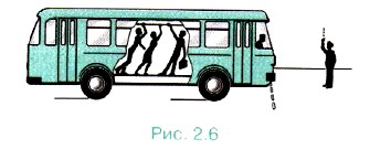 Однако, помимо инерциальных систем отсчёта, есть и другие, в которых тело имеет ускорение даже в том случае, когда на него другие тела не действуют. В качестве примера рассмотрим систему отсчёта, связанную с автобусом. При равномерном движении автобуса пассажир может не держаться за поручень, действие со стороны автобуса компенсируется взаимодействием с Землёй. При резком торможении автобуса стоящие в проходе пассажиры падают вперёд, получая ускорение относительно стенок автобуса (рис. 2.6). Однако это ускорение не вызвано какими-либо новыми воздействиями со стороны Земли или автобуса непосредственно на пассажиров. Относительно Земли пассажиры сохраняют свою постоянную скорость, но автобус начинает двигаться с ускорением, и пассажиры относительно него также движутся с ускорением. Ускорение появляется вследствие того, что движение их рассматривается относительно тела отсчёта (автобуса), движущегося с ускорением.