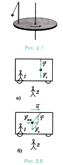 Рассмотрим маятник, находящийся на вращающемся диске (рис. 2.7). Нить маятника отклонена от вертикали, хотя сам он неподвижен относительно диска. Натяжение нити не может быть скомпенсировано силой притяжения к Земле. Следовательно, отклонение маятника нельзя объяснить только его взаимодействием с телами. Рассмотрим ещё один маятник, находящийся в неподвижном вагоне. Нить маятника вертикальна (рис. 2.8, а). Шарик взаимодействует с нитью и Землёй, сила натяжения нити равна силе тяжести. С точки зрения пассажира в вагоне и человека, стоящего на перроне, шарик находится в равновесии вследствие того, что сумма сил, действующих на него, равна нулю. Как только вагон начинает двигаться с ускорением, нить маятника отклоняется (шарик по инерции стремится сохранить состояние покоя). С точки зрения человека, стоящего на перроне, ускорение шарика должно быть равно ускорению вагона, так как нить не разрывается и шарик движется вместе с вагоном. Шарик по-прежнему взаимодействует с теми же телами, сумма сил этого взаимодействия должна быть отлична от нуля и определять ускорение шарика. С точки зрения пассажира, находящегося в вагоне, шарик неподвижен, следовательно, сумма сил, действующих на шарик, должна быть равна нулю, однако на шарик действуют те же силы — натяжения нити и сила Рис. 2.8 тяжести. Значит, на шарик (рис. 2.8, б) должна действовать сила В неинерциальных системах отсчёта основное положение механики о том, что ускорение тела вызывается действием на него других тел, не выполняется.