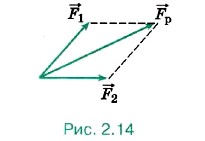 Рассмотрим сначала случай, когда на тело действуют две силы, направленные вдоль одной прямой. Если силы направлены в одну сторону (рис. 2.11), то равнодействующая p = 1 + 2, её модуль равен Fp = F1 + F2.