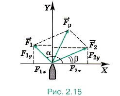 Если силы, действующие на тело, направлены под некоторым углом, то равнодействующую этих сил определяем по правилу параллелограмма: эта равнодействующая равна диагонали параллелограмма (рис. 2.14). Так как принцип суперпозиции сил справедлив и для проекций сил, то при выборе прямоугольной системы координат в проекциях на оси ОХ и OY уравнение m = 1 + 2 + ... можно записать в виде