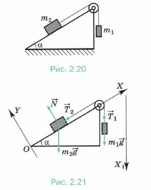 Задача 3. Два тела массами m1 = 10 г и m2 = 15 г связаны нерастяжимой и невесомой нитью, перекинутой через невесомый блок, установленный на наклонной плоскости (рис. 2.20). Плоскость образует с горизонтом угол α = 30°. Определите ускорение, с которым будут двигаться эти тела. Трение не учитывайте. Р е ш е н и е. Предположим, что тело массой m1 перетягивает. Выберем оси координат так, как показано на рисунке 2.21. В проекциях на оси Х1 и X уравнения движения тел запишем в виде m1ax1 = m1g - Т1, m2ах = Т2 — m2g sinα, |ах| =|ax1|, так как нить нерастяжима. Силы натяжения нити равны, так как нить и блок невесомы. Сложив левые и правые части уравнении, получим