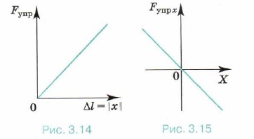 Учитывая, что координата х и проекция силы упругости деформированного тела Fx на ось X имеют противоположные знаки, можно также записать: Fx = -kx. (3.10) Эта закономерность хорошо выполняется только при упругих деформациях, при которых удлинение х тела мало. Она наблюдается при растяжении стержней из стали, чугуна, алюминия и других твёрдых упругих тел. Закону Гука подчиняется также деформация упругой пружины. На рисунке 3.14 показана зависимость модуля силы упругости деформированного тела от абсолютного значения его растяжения |x|, а на рисунке 3.15 — зависимость проекции силы упругости Fx того же тела от значения х.