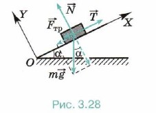 Задача 1. В результате полученного толчка кирпич начал скользить вниз по неподвижной ленте конвейера, расположенной под углом α = 30° к горизонтальной плоскости. Определите модуль и направление ускорения кирпича, если коэффициент трения скольжения кирпича о ленту конвейера μ = 0,6. Р е ш е н и е. Направим ось ОХ вдоль наклонной ленты конвейера вниз, а ось OY перпендикулярно ленте конвейера вверх (рис. 3.26). Так как кирпич движется вдоль оси ОХ, то его ускорение может быть направлено только вдоль этой оси вниз либо вверх. По второму закону Ньютона m Запишем уравнение (1) в проекциях на оси ОХ и OY: mаx = mg sinα - Fтр, (2)