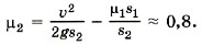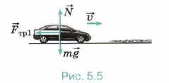 Р е ш е н и е. Согласно теореме об изменении кинетической энергии изменение кинетической энергии автомобиля равно алгебраической сумме работ всех сил, действующих на него. На автомобиль действуют (рис. 5.5) сила тяжести m Силы тяжести и нормальной реакции опоры перпендикулярны перемещению, поэтому работы их на данном перемещении равны нулю. Тогда 0 - mυ2/2 = -Fтр1s1 - Fтp2s2 = -(μ1s1 + μ2s2)N. Очевидно, что N = mg. Подставив N в уравнение, получим mυ2/2 = (μ1s1 + μ2s2)mg. Окончательно