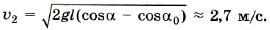 Задача 2. Маятник, представляющий собой маленький шарик, подвешенный на тонкой нити длиной 1 м, отклонили так, что нить стала составлять с вертикалью угол 60°. Затем шарик отпустили. Определите скорость шарика в тот момент, когда угол отклонения нити равен 30° и когда шарик проходит положение равновесия. Р е ш е н и е. На шарик во время движения действуют две силы — сила тяжести и сила натяжения (рис. 5.6). Изменение кинетической энергии шарика при перемещении из точки А в точку В равно: mυ22/2 - 0 = Ат + Ан. (1) Работа силы натяжения равна нулю, так как она всё время перпендикулярна перемещению. На основании закона о независимости движений движение шарика можно рассматривать как сумму двух движений: по оси ОХ и по оси OY. Работа силы тяжести при перемещении шарика вдоль оси ОХ равна нулю, так как сила тяжести перпендикулярна перемещению вдоль этой оси. Работа силы тяжести при перемещении вдоль оси OY равна Ат = mgΔy, где Δу = h1 - h2. Из треугольника АO2O1 получим O1O2 = lcosα0, тогда h1 = l - O1O2 = l(1 - cosα0), а из треугольника ВO2С получим O2С = lcosα, h2 = l - O2С = l(1 - cosα). Окончательно h1 - h2 = l(cosα - cosα0). Работа силы тяжести равна Ат = mgl(cosα - cosα0). Подставив найденное выражение для работы в уравнение (1), получим m22/2 = mgl(cosα - cosα0). Скорость в точке В: Перемещение шарика вдоль оси OY при движении из точки А в точку О равно h1. Тогда скорость шарика в точке О: Задача 3. Тело брошено вертикально вверх со скоростью υ0 = 10 м/с. Определите наибольшую высоту подъёма hmах, а также скорость тела на высоте, равной hmax/2. Силой сопротивления воздуха можно пренебречь. Р е ш е н и е. Изменение кинетической энергии тела при подъёме на максимальную высоту равно работе силы тяжести: 0 - mυ20/2 = -mghmax. Из этого уравнения сразу же получаем выражение для максимальной высоты подъёма: hmах = υ20/2g = 5 м. Скорость тела на некоторой высоте при падении равна его скорости на той же высоте при подъёме. Определим скорость тела при падении с максимальной высоты. Согласно теореме об изменении кинетической энергии mυ2/2 - 0 = mgh = mghmax/2. (Сила тяжести при спуске совершает положительную работу.) Тогда для скорости получаем формулу
