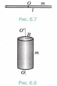 1. Момент инерции тонкого прямого стержня длиной l относительно оси, перпендикулярной к стержню и проходящей через его середину (рис. 6.7), равен: I = ml2/12. 2. Момент инерции прямого цилиндра (рис. 6.8), или диска относительно оси ОО', совпадающей с геометрической осью цилиндра или диска: I = mR2/2. 3. Момент инерции шара радиусом R относительно оси, проходящей через его центр: I = 2 mR2/5. 4. Момент инерции тонкого обруча радиусом R относительно оси, проходящей через его центр: I = mR2. Момент инерции по физическому смыслу во вращательном движении играет роль массы, т. е. он характеризует инертность тела по отношению к вращательному движению. Чем больше момент инерции, тем сложнее тело заставить вращаться или, наоборот, остановить вращающееся тело.
