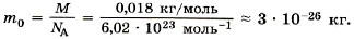 Глава 8. Основы молекулярно-кинетической теории § 54. Примеры решения задач по теме «Основные положения МКТ»При решении большей части задач нужно уметь определять молярные массы веществ. Для этого по известным из таблицы Менделеева относительным атомным массам надо определить относительную молекулярную массу, а затем и молярную массу по формуле М = 10-3 Мr кг/моль, где М — молярная масса, Мr — относительная молекулярная масса. Во многих задачах требуется по известной массе m тела определить количество вещества ν или число молекул (атомов) N в нём. Для этого используют формулы Задача 1. Определите молярную массу воды и затем массу одной молекулы воды. Р е ш е н и е. Относительная атомная масса водорода равна 1,00797, а кислорода равно 15,9994. Химическая формула воды — Н2O. Следовательно, относительная молекулярная масса воды равна: Мr = 2 • 1,00797 + 15,9994 = 18,01534 ≈ 18. Молярная масса воды М ≈ 10-3 • 18 кг/моль = 0,018 кг/моль. В любом веществе, взятом в количестве 1 моль, содержится NA молекул, где NA — число Авогадро; NA = 6,02 • 1023. Тогда масса одной молекулы воды