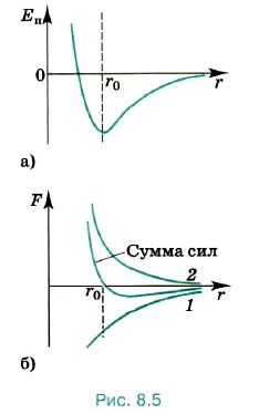 На расстояниях, превышающих 2—3 диаметра молекул, действуют силы притяжения. По мере уменьшения расстояния между молекулами сила их взаимного притяжения сначала увеличивается, но одновременно увеличивается и сила отталкивания. При определённом расстоянии r0 сила притяжения становится равной силе отталкивания. Это расстояние считается равным диаметру молекулы. При дальнейшем уменьшении расстояния электронные оболочки атомов начинают перекрываться и быстро увеличивается сила отталкивания. На рисунке 8.5 показаны графики зависимости потенциальной энергии взаимодействия молекул (рис. 8.5, а) и сил притяжения (1) и отталкивания (2) (рис. 8.5, б) от расстояния между молекулами. При r = r0 потенциальная энергия минимальна, сила притяжения равна силе отталкивания. При r > r0 сила притяжения больше силы отталкивания; при r < r0 сила притяжения меньше силы отталкивания. Молекулярно-кинетическая теория даёт возможность понять, почему вещество может находиться в газообразном, жидком и твёрдом состояниях. Итак, между молекулами действуют силы притяжения и они участвуют в тепловом движении. Агрегатное состояние вещества определяется тем, какое из этих двух свойств молекул является главным.