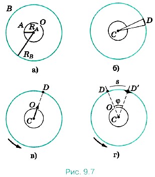 По проволочке пропускают электрический ток. В стенке этого цилиндра имеется узкая щель О. Воздух из цилиндров откачан. Цилиндр В находится при комнатной температуре. Вначале прибор неподвижен. При прохождении тока по нити она нагревается и при температуре 1200 °С атомы серебра испаряются. Внутренний цилиндр заполняется газом из атомов серебра. Некоторые атомы пролетают через щель О и, достигнув внутренней поверхности цилиндра В, осаждаются на ней. В результате прямо против щели образуется узкая полоска D серебра (рис. 9.7, б). Затем цилиндры приводят во вращение с большим числом оборотов n в секунду (до 1500 1/c). Теперь за время t, необходимое атому для прохождения пути, равного разности радиусов цилиндров RB - RА, цилиндры повернутся на некоторый угол φ. В результате атомы, движущиеся с постоянной скоростью, попадают на внутреннюю поверхность большого цилиндра не прямо против щели О (рис. 9.7, в), а на некотором расстоянии s от конца радиуса, проходящего через середину щели (рис. 9.7, г): ведь атомы движутся прямолинейно. Если через υB обозначить модуль скорости вращения точек поверхности внешнего цилиндра, то s = υBt = 2 πnRBt. (9.20) В действительности атомы серебра имеют разные скорости. Поэтому расстояния s для различных атомов будут несколько различаться. Под s следует понимать расстояние между участками на полосках D и D' с наибольшей толщиной слоя серебра. Этому расстоянию будет соответствовать средняя скорость атомов, которая равна Подставляя в эту формулу значение времени t из выражения (9.20), получаем