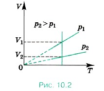 Согласно уравнению (10.7) объём газа при постоянном давлении пропорционален температуре: V = const • Т. (10.8)