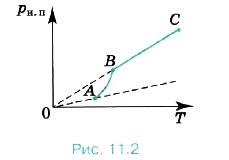 Когда вся жидкость испарится, пар при дальнейшем нагревании перестанет быть насыщенным и его давление при постоянном объёме будет возрастать прямо пропорционально абсолютной температуре (см. рис. 11.2, участок кривой ВС).