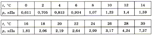 Глава 11. Взаимные превращения жидкостей и газов § 71. Примеры решения задач по теме «Насыщенный пар. Влажность воздуха»При решении задач надо иметь в виду, что давление и плотность насыщенного пара не зависят от его объёма, а зависят только от температуры. Уравнение состояния идеального газа приближённо применимо и для описания насыщенного пара. Но при сжатии или нагревании насыщенного пара его масса не остаётся постоянной. При решении некоторых задач могут понадобиться значения давления насыщенного пара при некоторых температурах. Эти данные нужно брать из таблицы. Задача 1. Закрытый сосуд объёмом V1 = 0,5 м3 содержит воду массой m = 0,5 кг. Сосуд нагрели до температуры t = 147 °С. На сколько следует изменить объём сосуда, чтобы в нём содержался только насыщенный пар? Давление насыщенного пара рн. п при температуре t = 147 °С равно 4,7 • 105 Па. Р е ш е н и е. Насыщенный пар при давлении рн. п занимает объём, равный