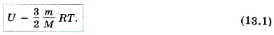 Механическая энергия тела (системы) как целого не входит во внутреннюю энергию. Например, внутренняя энергия газов в двух одинаковых сосудах при равных условиях одинакова независимо от движения сосудов и их расположения относительно друг друга. Вычислить внутреннюю энергию тела (или её изменение), учитывая движение отдельных молекул и их положения относительно друг друга, практически невозможно из-за огромного числа молекул в макроскопических телах. Поэтому необходимо уметь определять значение внутренней энергии (или её изменение) в зависимости от макроскопических параметров, которые можно непосредственно измерить. Внутренняя энергия идеального одноатомного газа. Вычислим внутреннюю энергию идеального одноатомного газа. Согласно модели молекулы идеального газа не взаимодействуют друг с другом, следовательно, потенциальная энергия их взаимодействия равна нулю. Вся внутренняя энергия идеального газа определяется кинетической энергией беспорядочного движения его молекул. Для вычисления внутренней энергии идеального одноатомного газа массой т нужно умножить среднюю кинетическую энергию одного атома на число атомов. Учитывая, что kNA = R, получим формулу для внутренней энергии идеального газа: