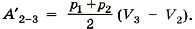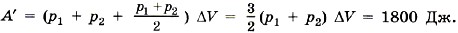 Задача 4. На рисунке 13.4 показана зависимость давления газа от объёма при его переходе из состояния 1 в состояние 4. Определите работу газа. Р е ш е н и е. Работа газа численно равна площади заштрихованной фигуры. Процессы 1—2 и 3—4 изобарные, поэтому работа газа в этих процессах А'1 - 2 = p1(V2 - V1), А'3-4 = p2(V4 - V3). В процессе 2—3 изменяются все три параметра газа. Работа газа в этом процессе Таким образом, учтя, что V2 — V1 = V3 — V2 = V4 — V3 = ΔV, получим