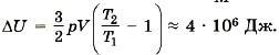 Глава 13. Основы термодинамики § 75. Примеры решения задач по теме «Внутренняя энергия. РаботаДля решения задач нужно уметь вычислять внутреннюю энергию и работу, пользуясь формулами (13.1) и (13.4). Надо ещё иметь в виду, что величины A, Q, ΔU могут быть как положительными, так и отрицательными. Задача 1. Аэростат объёмом V = 500 м3 наполнен гелием под давлением р = 105 Па. В результате солнечного нагрева температура газа в аэростате поднялась от t1 = 10 °С до t2 = 25 °С. На сколько увеличилась внутренняя энергия газа? Р е ш е н и е. Гелий является одноатомным газом, поэтому его внутренняя энергия определяется формулой (13.1). При температуре Т1 эта энергия равна