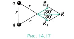 Глава 14. Электростатика § 91. Примеры решения задач по теме «Напряжённость электрического поля. Принцип суперпозиции полей»При решении задач с использованием понятия напряжённости электрического поля нужно прежде всего знать формулы (14.8) и (14.9), определяющие силу, действующую на заряд со стороны электрического поля, и напряжённость поля точечного заряда. Если поле создаётся несколькими зарядами, то для расчёта напряжённости в данной точке надо сделать рисунок и затем определить напряжённость как геометрическую сумму напряжённостей полей. Задача 1. Два одинаковых положительных точечных заряда расположены на расстоянии r друг от друга в вакууме. Определите напряжённость электрического поля в точке, расположенной на одинаковом расстоянии r от этих зарядов.