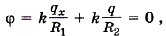 Согласно принципу суперпозиции потенциал любой точки поля складывается из потенциала поля заряда q, проводящей сферы радиусом R1, с зарядом -q и проводящей сферы радиусом R2 с зарядом +q.