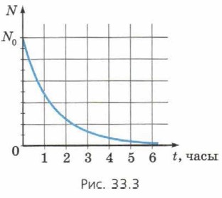 На рисунке 33.3 приведён пример графика закона радиоактивного распада для случая, когда период полураспада равен 1 ч. Через 1 ч остаётся 1/2 часть первоначального числа ядер, через 2 ч — 1/4 часть и т. д.