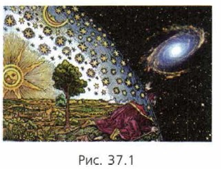 § 37. Размеры Солнечной системы Земля и ЛунаЗемляКакой представляли Землю в древностиВ древности Землю считали плоской и, по нынешним меркам, совсем небольшой. В те времена Земля и «небесная твердь» над ней составляли всю Вселенную (так и сегодня называют всё, что только существует). Вокруг Земли вращалась «небесная твердь» с прикреплёнными к ней звёздами- жемчужинками, а между этой твердью и Землёй двигались Солнце и Луна (рис. 37.1).