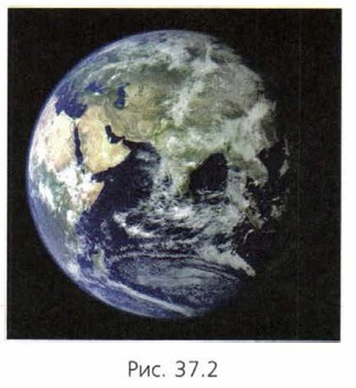 Правда, если присмотреться внимательнее, в ночном небе можно было увидеть несколько странных ярких звёзд, которые ночь от ночи чуть смещались относительно всех остальных звёзд. Их назвали планетами, что в переводе с греческого означает «блуждающие». Кто определил форму Земли?О том, что Земля — огромный шар, догадались древние греки. Живя у моря, они часто замечали, что корабль уходит за линию горизонта, как за огромный холм. Суда скрывались из виду одинаково, в каком бы направлении они ни плыли, и, будучи математиками, греки догадались, что Земля имеет форму шара, — ведь только поверхность шара закругляется во все стороны одинаково. Сегодня, когда можно рассматривать снимки Земли из космоса (рис. 37.2), шарообразность её формы кажется очевидной.