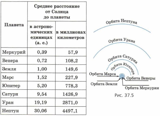 § 37. Размеры Солнечной системы Орбиты планет (продолжение)Астрономы догадались, что подобный способ можно использовать для измерения расстояния от Земли до другой планеты. Роль двух глаз могут играть два телескопа, направленные на одну планету из разных точек земного шара (рис. 37.4, б). В эти телескопы планета видна в один и тот же момент времени на фоне различных участков звёздного неба. Во второй половине 17-го века таким способом измерили расстояние до Марса, что позволило определить и масштаб Солнечной системы. Расстояние до Солнца и размеры планетных орбитИзмерения показали, что среднее расстояние от Земли до Солнца равно 149 600 000 км. Эту величину3 называют астрономической единицей (1а. е.). 3 В приближённых расчётах 1 а. е. обычно принимают равной 150 000 000 км. Сегодня считают, что в Солнечной системе восемь больших планет: Меркурий, Венера, Земля, Марс, Юпитер, Сатурн, Уран и Нептун (планеты перечислены в порядке удаления от Солнца). В таблице ниже приведены расстояния от Солнца до планет, а на рисунке 37.5 — схема орбит планет Солнечной системы (с соблюдением масштаба).