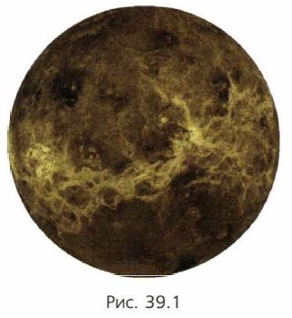 В «меркурианский полдень» поверхность этой ближайшей к Солнцу планеты нагревается выше 400 °С. При такой температуре скорости молекул газов сравнимы со второй космической скоростью2 для Меркурия (примерно 4 км/с). И поэтому у Меркурия нет атмосферы: он просто не может её удержать. 2 Напомним, что второй космической скоростью называется скорость, которую надо сообщить телу, чтобы оно навсегда покинуло окрестности планеты. Невыносимая дневная жара на Меркурии сменяется лютым ночным холодом: до -170 °С. Объясняется это двумя причинами: во-первых, отсутствием атмосферы, во-вторых, большой длительностью меркурианских дня и ночи. Поверхность Меркурия изрыта кратерами от ударов космических тел (см. рис. 39.1). Один удар был так силён, что его след виден на диаметрально противоположной удару стороне планеты. Однако не стоит особенно жалеть Меркурий, рассматривая эти страшные следы ударов. Это неизбежные «трудности роста» при формировании планет: поглощая попадавшие в них при столкновениях космические тела, планеты росли, набирая массу и становясь так называемыми «большими планетами».