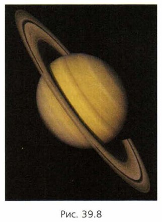 § 39. Природа тел Солнечной системы Планеты-гиганты (окончание)У Юпитера около трёх десятков спутников. Четыре самые большие спутника были открыты ещё Галилеем; наибольший из них даже больше Меркурия, который считается «большой планетой». С такой свитой спутников (сходных к тому же по своему строению с планетами земной группы) Юпитер напоминает Солнечную систему в миниатюре. Это сходство усиливается также тем, что Юпитер — источник энергии: как показали измерения, он излучает почти в 2 раза больше энергии, чем получает от Солнца. Источник энергии Юпитера именно тот, какой предложил Гельмгольц для объяснения происхождения солнечной энергии, и где он оказался неправ. Его теория, которая не могла объяснить происхождение энергии Солнца, смогла объяснить происхождение энергии Юпитера: она обусловлена продолжающимся сжатием планеты под действием сил тяготения. Как вы уже знаете, именно такое сжатие «зажигает» звёзды. Так что Юпитер, в некотором смысле, является несостояв- шейся (из-за слишком «малой» массы) звездой. Отметим также «звёздный» химический состав Юпитера: он, как и большинство звёзд (в том числе и Солнце), состоит почти целиком из водорода и гелия. СатурнСамая яркая особенность Сатурна — роскошное кольцо, открытое ещё Галилеем (рис. 39.8). В верхней части снимка кольцо частично закрыто тенью Сатурна. В нижней части снимка видны спутники Сатурна (светлые точки).