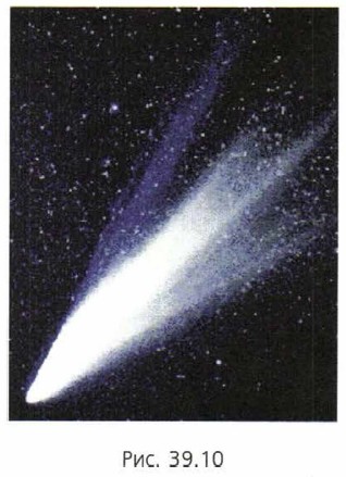 Общая масса астероидов не превышает одной тысячной массы Земли, причём половина этой массы сосредоточена всего в трёх астероидах, диаметр наибольшего из которых около 1000 км. Ещё сравнительно недавно считалось, что астероиды — это остатки планеты, находившейся некогда между Марсом и Юпитером и разрушенной в результате космической катастрофы. Но сегодня учёные пришли к выводу, что астероиды — это зародыши несостоявшейся планеты. Объединиться в большую планету астероидам помешали приливные силы, действующие со стороны близкого и очень массивного Юпитера: они безжалостно разрывали сколько-нибудь крупное образование. КометыМы уже говорили о кометах, рассказывая о размерах Солнечной системы. Самая примечательная особенность кометы — огромный хвост, длина которого составляет порой десятки миллионов километров (рис. 39.10).