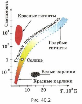 § 40. Разнообразие звёзд Светимость и температура звёздДиаграмма «температура — светимость»В начале 20-го века датский астроном Э. Герцшпрунг и американский астроном Г. Рессел решили выяснить: как связана светимость звезды с её температурой? Поскольку каждая звезда имеет определённую температуру и светимость, она может быть представлена точкой на координатной плоскости, по осям координаты которой отложены температура и светимость звезды (рис. 40.2). Плоскость, на которой отмечено таким образом большое количество звёзд, мы будем называть диаграммой «температура — светимость»1. 1 Герцшпрунг и Рессел вместо температуры звёзд использовали их «спектральные классы» (соответствующая диаграмма называется диаграммой Герцшпрунга — Рессела). Использование температуры звёзд делает диаграмму более наглядной. Герцшпрунг и Рессел заметили, что почти все звёзды сгруппировались в несколько областей, главные из которых обозначены на рисунке 40.2.