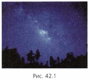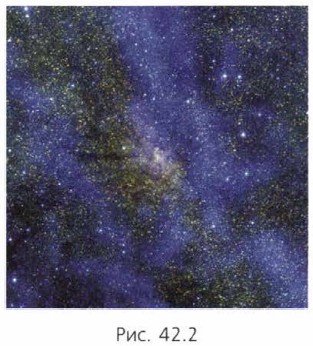 Древних астрономов удивляло, что эта светящаяся туманность никогда не меняет ни своей формы, ни положения на небесном своде, — ведь такое постоянство свойственно только звёздам. Загадку Млечного Пути разгадал Галилео Галилей, направив на него построенный им телескоп: оказалось, что это — колоссальное скопление звёзд. И тогда стало понятно, почему форма и положение этой «туманности» остаются неизменными. На рисунке 42.2 показано, каким видится небольшой участок Млечного Пути, если рассматривать его в телескоп.