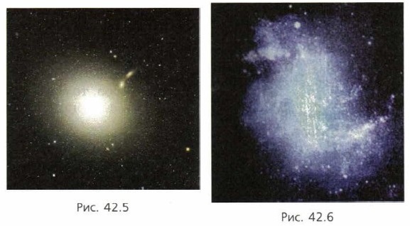 Отдельные видимые на этой фотографии звезды — это звёзды нашей Галактики, находящиеся во много раз ближе к нам, чем галактика Андромеды. В середине 18-го века немецкий учёный И. Кант предположил, что туманность Андромеды — это очень далёкая огромная звёздная система, подобная нашей. Предположение Канта подтвердилось в начале 20-го века, когда американский астроном Эдвин Хаббл с помощью только что построенного очень мощного телескопа смог различить отдельные звёзды по краям туманности Андромеды. Согласно современным представлениям туманность Андромеды — это такая же гигантская звёздная система, как и наша Галактика, даже несколько больше. Её назвали галактикой Андромеды. От нашей Галактики до галактики Андромеды около 2 миллионов световых лет. Галактика Андромеды также является спиральной. С открытия галактики Андромеды началась эра «галактической астрономии»: в 20-м веке астрономы открыли, что существуют миллиарды галактик. Типы галактикВ 1923 году Хаббл заметил, что все галактики по форме можно разделить на три типа. Кроме уже знакомых нам спиральных галактик, существуют также эллиптические (рис. 42.5) и неправильные (рис. 42.6).