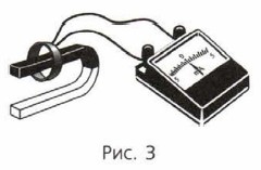 Для каждого случая замечайте максимальное значение силы индукционного тока и его направление (по отклонению стрелки миллиамперметра). Запишите вывод. 2. Переверните магнит и наденьте катушку на его южный полюс, а затем снимите её. Повторите опыт, увеличив скорость движения катушки. Обратите внимание на показания миллиамперметра, в частности на направление отклонения стрелки прибора. Запишите выводы. 3. Сложите два магнита (полосовой и дугообразный) одноимёнными полюсами и повторите эксперимент с разной скоростью движения катушки относительно магнитов. Запишите вывод. 4. Соберите установку, схематически изображённую на рисунке 4.