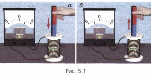 Соединим концы проволочной катушки с чувствительным амперметром1. Если вдвигать в катушку магнит, как показано на рисунке 5.1, а, то амперметр покажет, что в катушке возникает ток. Этот ток называют индукционным. 1 В качестве такого амперметра часто используют гальванометр.