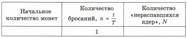 2. Перемешайте монеты в коробке и высыпьте на поднос. Подсчитайте число «нераспавшихся ядер» N (то есть монет, которые легли орлом вверх) и запишите в таблицу (после первого бросания это число будет примерно равно половине начального количества монет). Положите «распавшиеся ядра» (то есть монеты, которые легли решкой вверх) во вторую коробку, а «нераспавшиеся ядра» — обратно в первую коробку для повторения опыта. 3. Повторите опыт, описанный в пункте 2, ещё 9 раз. Результаты подсчёта «нераспавшихся ядер» N записывайте каждый раз в таблицу. 4. Постройте в тетради график зависимости N(t), соответствующий формуле радиоактивного распада N = N0 • 2-n. Отметьте в этих же координатах ваши экспериментальные точки и сделайте вывод. Запишите его. 5. Запишите выводы из эксперимента.