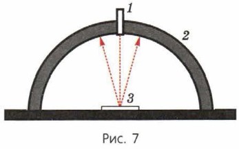 9. Соберите установку для нахождения интерференционных максимумов (рис. 7). Лазерный фонарик 1 укреплён на самодельном транспортире 2. Луч фонарика 3 отражается от лежащего на столе компакт-диска.