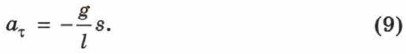 § 13. Более сложные вопросы колебаний Математический маятникНапомним, что математическим маятником называют подвешенный на нити груз, если его можно считать материальной точкой, а массой нити и её деформацией можно пренебречь. При колебаниях груз движется по дуге окружности. Как мы уже знаем, скорость груза при этом в любой момент времени направлена по касательной к этой окружности. Поэтому согласно второму закону Ньютона изменение скорости по модулю обусловлено проекцией равнодействующей приложенных к грузу сил на направление касательной к окружности. «Вклад» в эту проекцию даёт только сила тяжести, потому что сила натяжения нити направлена вдоль нити, то есть перпендикулярно скорости груза. Обозначим Fτ проекцию силы тяжести на касательную к траектории груза в тот момент, когда нить составляет угол а с вертикалью.