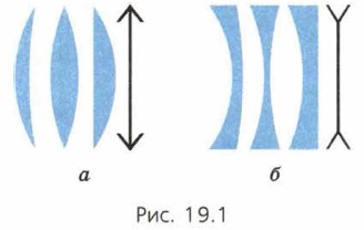 1 Одна из двух поверхностей может быть плоской. Если линза посредине толще, чем у краёв, её называют выпуклой (рис. 19.1, а), а если она посередине тоньше, чем у краёв, то вогнутой (рис. 19.1, б). На рисунке 19.1 приведены обозначения линз на чертежах.