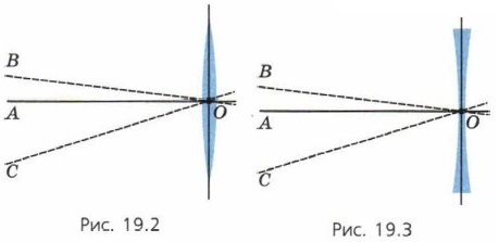 Мы будем рассматривать линзы, толщина которых намного меньше радиусов сферических поверхностей, ограничивающих линзу. Такие линзы называют тонкими. Приближённо можно считать, что тонкая линза лежит в одной плоскости. Её называют плоскостью линзы. Точку О плоскости линзы, которой соответствует максимальная толщина выпуклой линзы (рис. 19.2) или минимальная толщина вогнутой линзы (рис. 19.3), называют оптическим центром линзы.