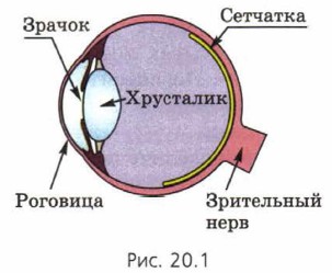 Роговица и хрусталик выполняют вместе роль собирающей линзы, с помощью которой на сетчатке, состоящей из светочувствительных клеток, получается действительное уменьшенное и перевёрнутое изображение предметов. Схематически это показано на рисунке 20.2.