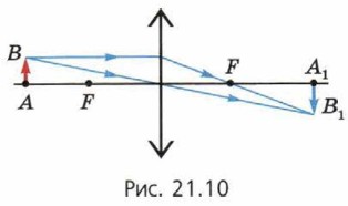 § 21. Более сложные вопросы геометрической оптики Построение изображения в линзеИзображение точки, лежащей на главной оптической оси линзыДля построения изображения такой точки нельзя воспользоваться уже знакомыми нам двумя «удобными» лучами, с помощью которых строят изображение точки в линзе (проходящим через оптический центр линзы и параллельным её главной оптической оси). Дело в том, что в данном случае оба эти луча сливаются в один луч, идущий вдоль главной оптической оси. Однако построить изображение точки, лежащей на главной оптической оси линзы, можно. Это можно сделать несколькими способами, мы покажем два из них. Все способы используют основное свойство линзы: после преломления в линзе лучей, исходящих из одной точки, эти лучи или их продолжения пересекаются в одной точке. Мы покажем построение изображения точки, лежащей на главной оптической оси, только в собирающей линзе, причём для случая, когда эта точка лежит дальше фокальной плоскости линзы. Остальные случаи мы предлагаем вам рассмотреть самостоятельно. 1. Замена точки «стрелкой»Будем рассматривать точку А как начало стрелки АВ, параллельной плоскости линзы, и построим с помощью «удобных» лучей её изображение А1В1 в линзе (рис. 21.10). Точка А1 — изображение точки А.