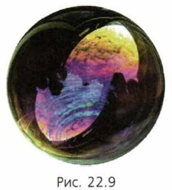 § 22. Интерференция волн Интерференция света (окончание)Цвета тонких плёнокПочему мыльный пузырь, состоящий из бесцветной воды и бесцветного раствора мыла, играет всеми цветами радуги (рис. 22.9)?