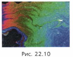 Подобное появление яркой цветной окраски можно наблюдать, если пролить масло или бензин на воду (рис. 22.10). Яркие цвета тонких плёнок объясняются интерференцией света, отражённого от двух поверхностей тонкой плёнки — верхней и нижней.