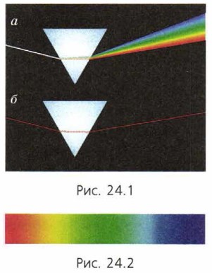Направим в темноте узкий пучок солнечного света на боковую грань треугольной стеклянной призмы. В результате преломления света в призме на белом экране можно получить красивую цветную полосу, где можно различить все цвета радуги: красный, оранжевый, жёлтый, зелёный, голубой, синий, фиолетовый1 (рис. 24.1, а). 1 В предложении «Каждый Охотник Желает Знать, Где Сидит Фазан» первые буквы слов совпадают с первыми буквами названий цветов в радуге. Эту цветную полосу (рис. 24.2) Ньютон назвал спектром2. 2 От латинского «спектрум» — видимое.